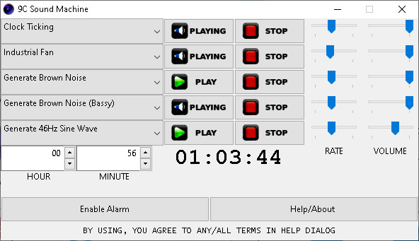 9C Sound Machine See also: Online Brown Noise Generator ![]() Free. Plays white noise, and others, perhaps to drown out the neighbors' garbage music playing at midnight or whatever you may need it for. I'm not currently maintaining a Linux version any longer however the Windows version works perfectly in Wine. Using the rate dial may completely reverse desirability/undesirability for certain sounds to some individuals, so feel free to experiment with it. The 46Hz generator creates a pleasant rumble when used with a decent subwoofer that, in my case, completely silences all sounds from adjacent apartments with the speaker in a corner of the room, and cannot be heard at all when I'm not near a wall. Without a subwoofer it will likely have no effect and you might not even hear it. Uses: --------------------- Drowning out neighbors Calming yourself, kids, students, coworkers, etc ADD/ADHD Focus Inducing sleepiness (all ages) Deeper sleeping Tinnitus suppression Localizing conversations Quieting fireworks/other sounds for panicking pets Silencing misophonia trigger sounds ![]() Downloads for Windows 7/8/10/11: Compact 0.07MB - procedurally generated sounds only Standard 3.09MB - has built-in samples as well Android version soon. |