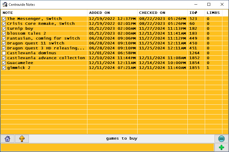 I created this app to use the best note taking method I could come up with for myself. Every note is a single line, and you can double click to "enter" into one as every note is also a list. This works endlessly. It is essentially a tree of any shape. Limbs can be plucked and placed on other limbs in any order. It has the ability to output any list as a [printable checklist], and can import txt files and text from the clipboard where each line is a note/task. As a result, it can also be used to convert txt files into printable checklists or todo lists. Color and font can be selected if the defaults are unappealing. ![]() ![]() Downloads for Windows XP/Vista/7/8/10/11: [Centravide 0.1] 1MB |